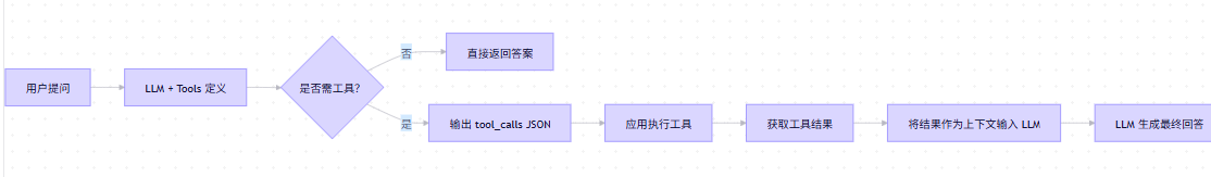 4. 反馈与生成:将工具返回结果以 tool 角色消息追加到对话历史,再次调用 LLM 生成最终回答。