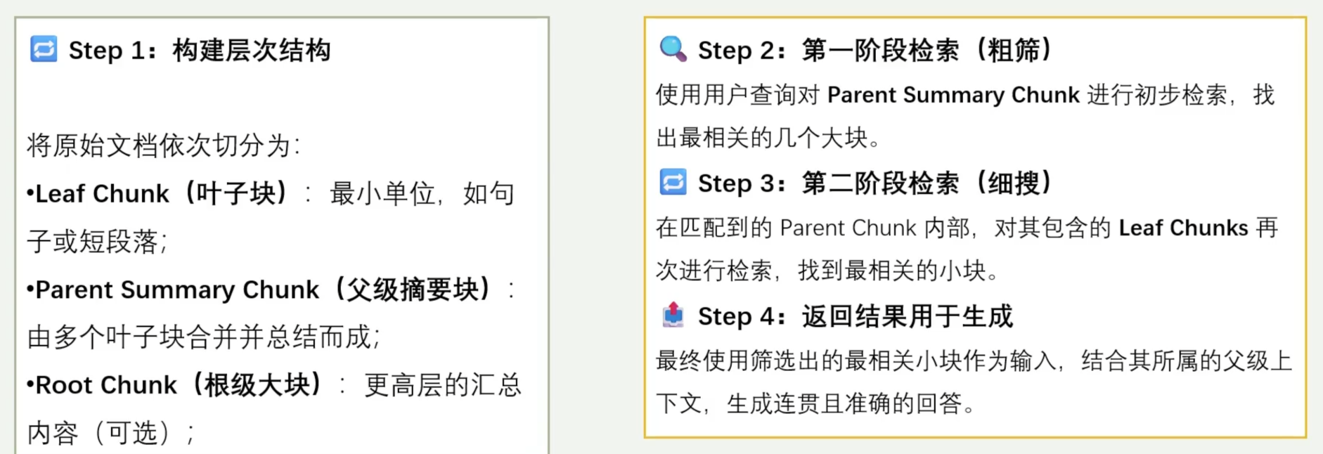核心思路:结合小块的精准匹配与大块的上下文完整性。 将文本数据按不同粒度组织成“多级索引”的方式,先用大块进行初步检索,再用匹配的大块中进一步细化检索,从而实现精度与上下文之间的平衡。