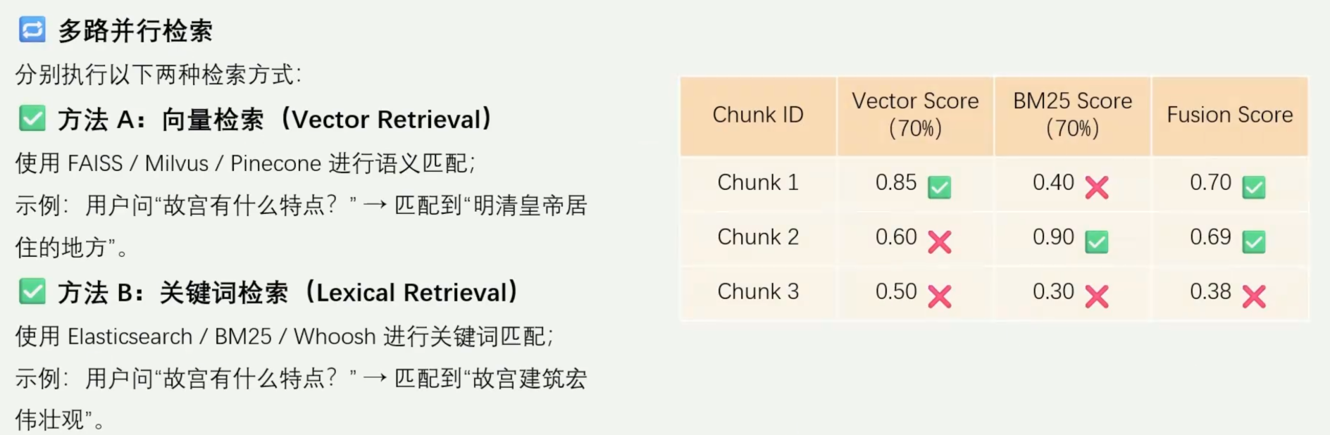 核心思路:将多种检索方法(如向量检索、关键词检索、布尔检索等)的结果进行加权融合,利用不同方法的互补优势,减少漏检,提高整体的召回率和相关性。
