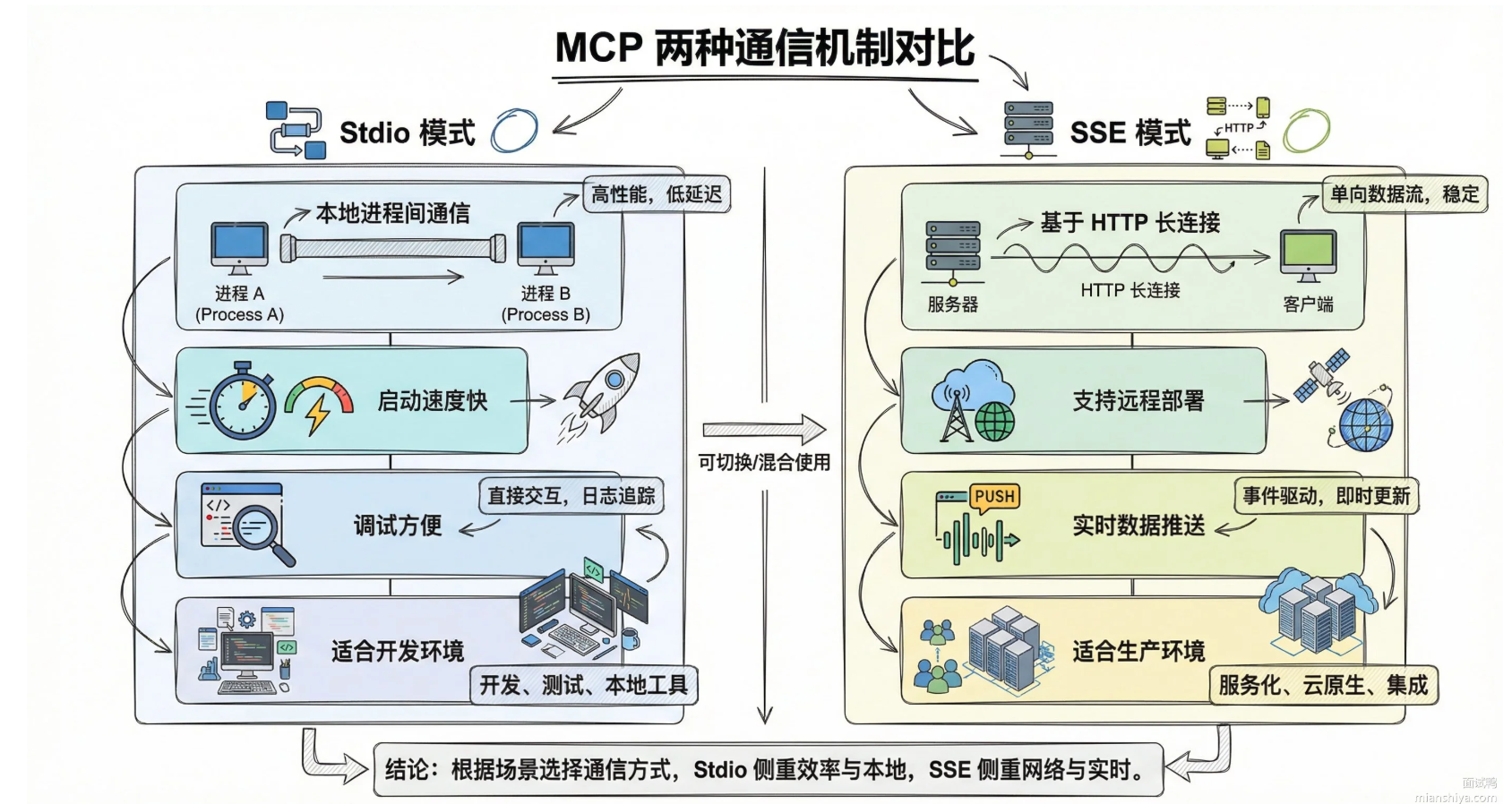MCP 支持两种底层传输方式,适用场景完全不同: