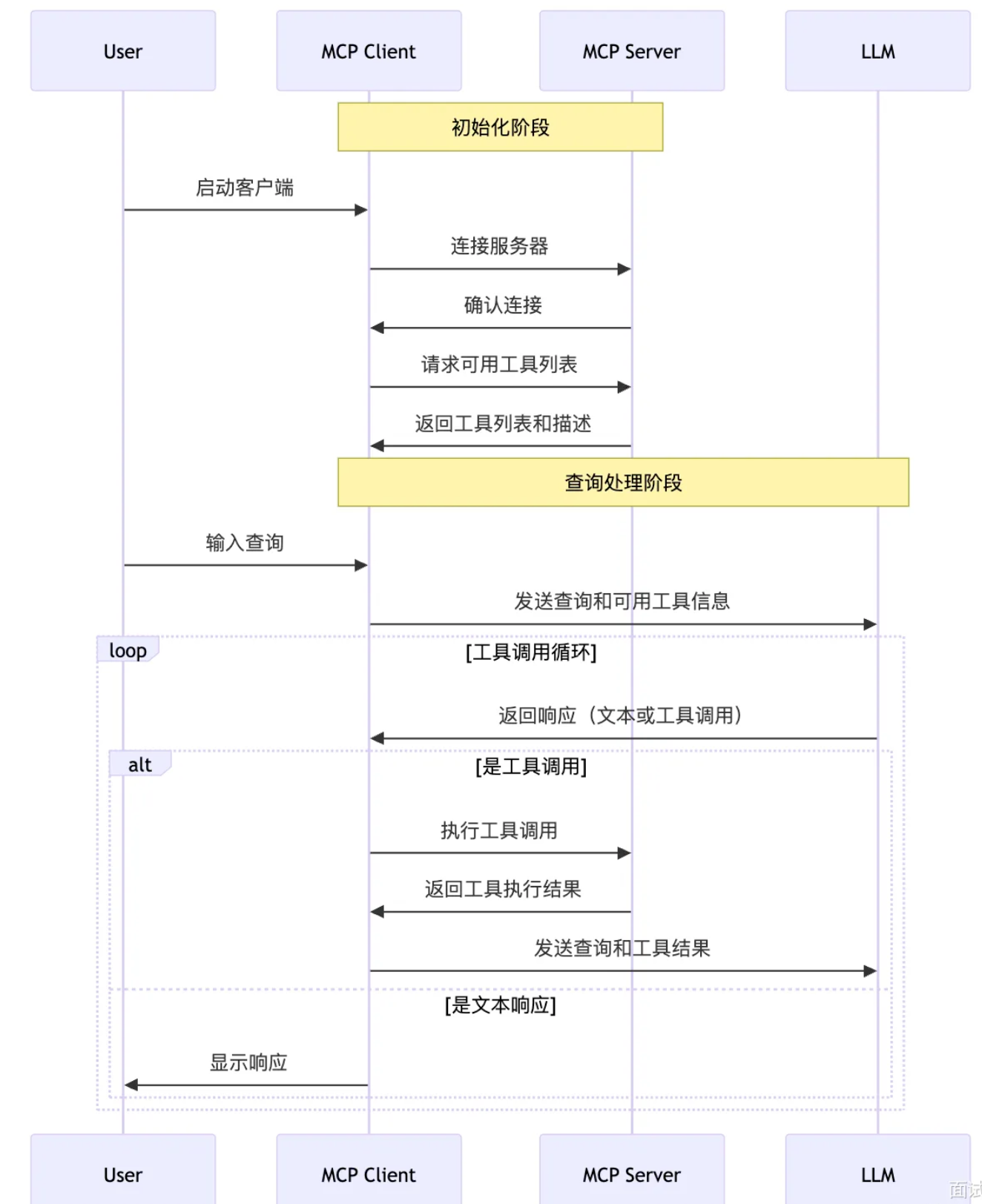 MCP 的核心工作流程是一个客户端-服务器协作的闭环,整体分为7个阶段: