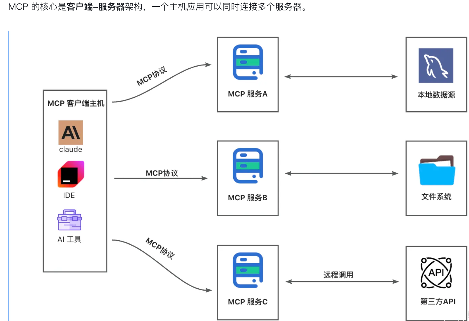 1)初始化连接:主机应用启动后,MCP Client 与 MCP Server 建立连接。一个主机可以同时连多个 Server,每个 Server负责不同的工具和资源。