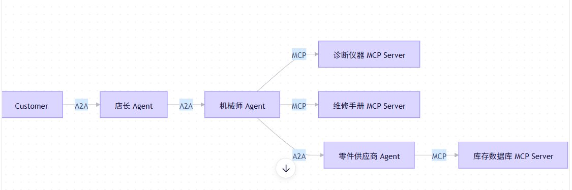 店长通过 A2A 委派任务给“机械师 Agent”。
