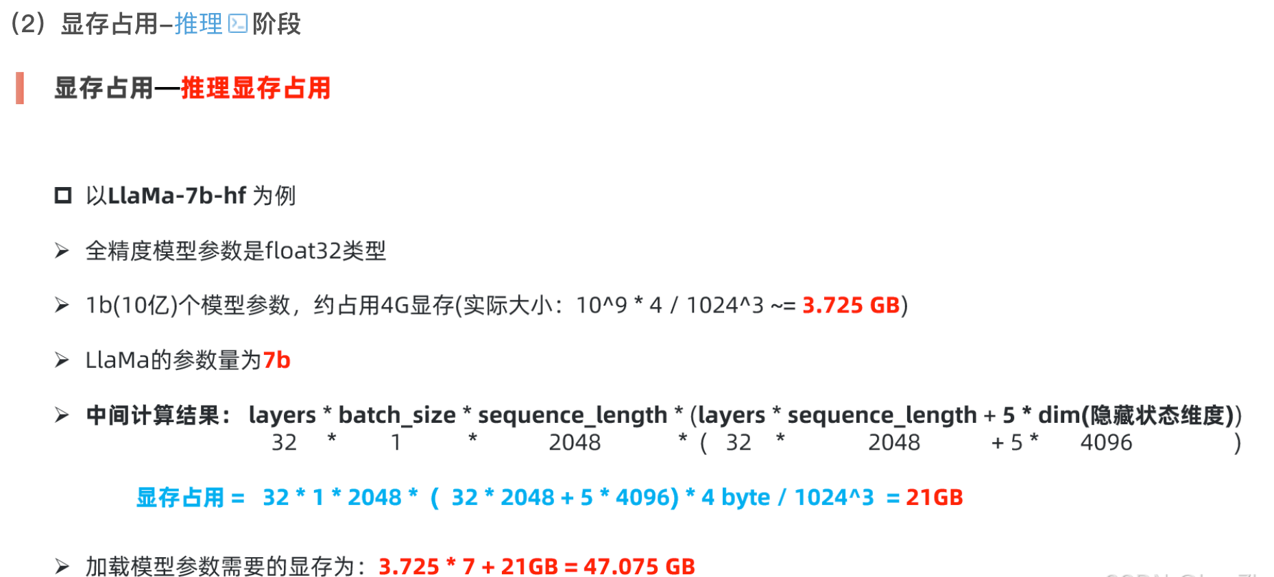 总显存 ≈ 参数显存 × (4 + 2/n)。其中,n为数据并行卡数。例如,单卡训练7B模型,参数显存14GB,总需求约14GB×6=84GB。推理阶段粗略估算: